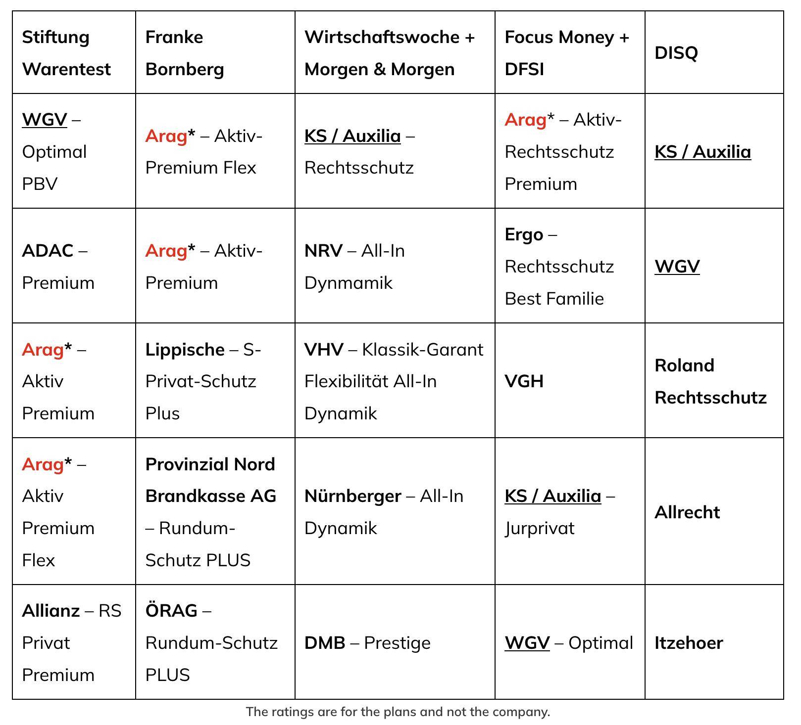 According to the rating agencies, here are the top-rated legal insurance plans in Germany. ConclusionThree out of five rating agencies in Germany rate the legal insurance plans from the following companies among the best.